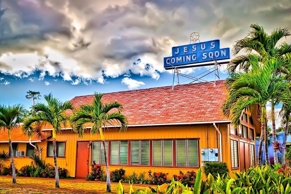 As I gazed at this vibrant scene from Lahaina, Maui, I was immediately struck by the bold colors and tropical charm. The "Jesus Coming Soon!" sign atop the cheerful yellow church creates a captivating focal point against the dramatic sky. Let's dive into how we can bring this lively energy into your home!